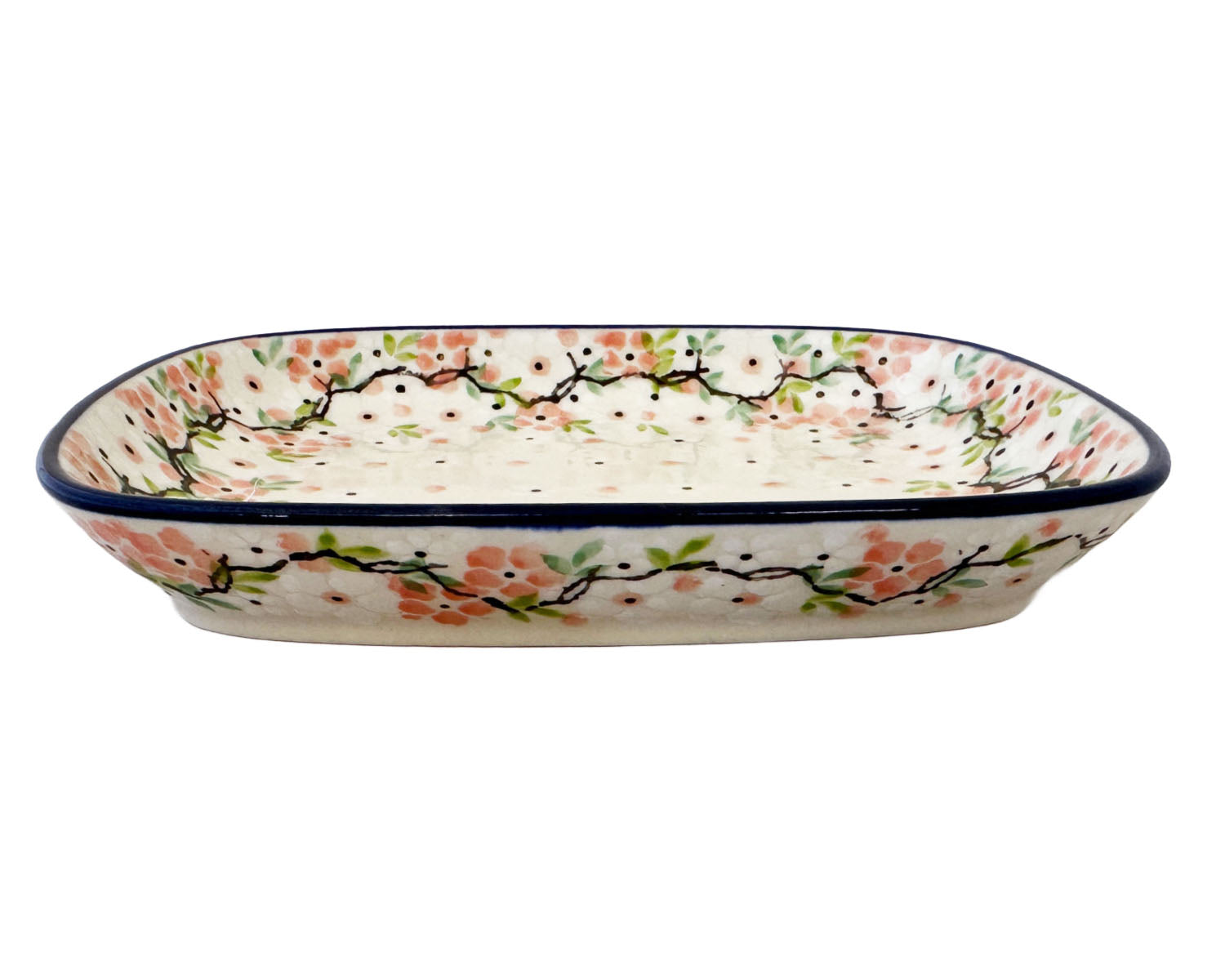 These smaller Polish pottery trays are very versatile. They make a great snack or sandwich plate. They can easily be used as serving pieces due to their upturned sides. They are perfect for desserts like cake and pie. This dish can also be used easily in a toaster oven. For example, you can easily roast some asparagus with this dish. Also, breakfast is another great option. It will hold your eggs and toast (or fruit) with ease. There are just so many options with this shape/size.